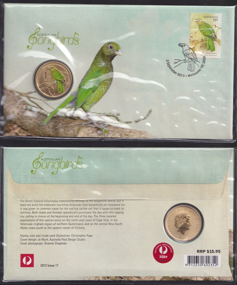 2013 Australian Songbirds Green Catbird PNC with Coloured Tuvalu $1 Coin